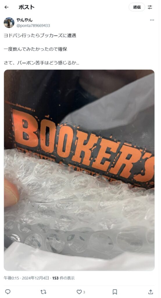 急げー#ブッカーズ #ウイスキー #山崎 #白州 #響 pic.twitter.com/SsgykCIkAt— にんじん (@Mrs1carrot) December 7, 2024